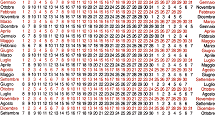Il numero superiore (in rosso) indica il primo giorno dell’ultima mestruazione, quello inferiore (in nero) la data del parto