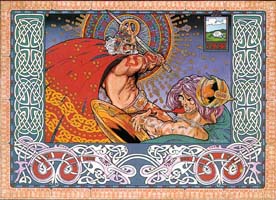 E mentre il Dagda piantava il fuoco di smeraldo e Angus giocava con esse, Mananaun era consapevole che i mostri esiliati si erano alzati e guardavano oltre il bordo del mantello di Brigit. Vide gli occhi delle strane creature brillare nell’oscurità ed estrasse la Spada di Luce dal fodero e avanzò puntandola verso il caos e le strane creature fuggirono tra spruzzi di spuma sibilante,e per salutare la Spada montando in un’onda tonante.