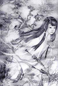 Intanto che si svolgeva questo dialogo dentro la scorza di granchio, la Fata si era seduta in groppa, e il giovane manovrando le zampe del granchio come al solito, la trasportava per le vie sotterranee verso il mare aperto, senza che essa sospettasse che insieme a lui era nascosta la figlia del Re. Lasciata la Fata e tornando a nuotare verso la peschiera, il Principe, perché era un Principe, spiegava alla sua innamorata, stretti insieme dentro la scorza di granchio cosa doveva fare per liberarlo, “Devi andare su uno scoglio in riva al mare e metterti a suonare e cantare. La Fata va matta per la musica e uscirà dal mare a ascoltarti e ti dirà: ‘Suoni, bella giovane, mi piace tanto.’ E tu risponderai: ‘Sì che suono, basta che lei mi dia quel fiore che ha in testa’. Quando avrai quel fiore in mano, sarò libero, perché quel fiore è la mia vita.”