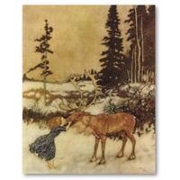 «Tu sei così intelligente» disse la renna. «So che sei in grado di legare tutti i venti del mondo con un filo da cucire; quando il navigatore scioglie un nodo, riceve un buon vento, se ne scioglie un altro, allora il vento si fa più forte; se poi scioglie anche il terzo e il quarto, allora c’è tempesta e i boschi vengono sradicati. Non vuoi dare a questa bambina una bevanda in modo che abbia la forza di dodici uomini e possa vincere la regina della neve?»