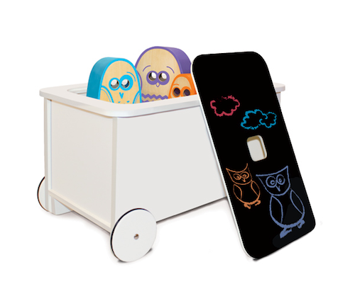 Questo porta giocattoli è dotato di due ruote posteriori utili per spostarlo e di una lavagna su cui divertirsi a disegnare. Il coperchio a lavagna può essere pulito facilmente con un panno umido. Se siete interessate ad acquistarlo cliccate su questo link.